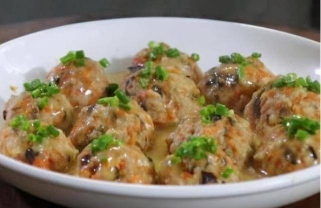 4、肉丸子出锅后,另起锅,放少许油,油烧至冒青烟,加入清水,放生抽、蚝油、盐,最后来上一勺生粉水收汁;把汁淋在香菇胡萝卜肉丸上,洒上一些葱花即可。