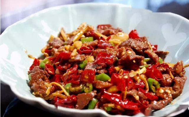 食材:牛肉、干红辣椒、姜、蒜、青椒、酱油、生抽、胡椒粉、生粉、花椒、料酒