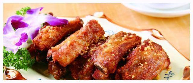 2. 大蒜切蒜蓉备用。锅里放入能没过排骨的油,油温到伸筷子进去有冒小泡就下排骨炸,炸熟外表金黄就捞出。