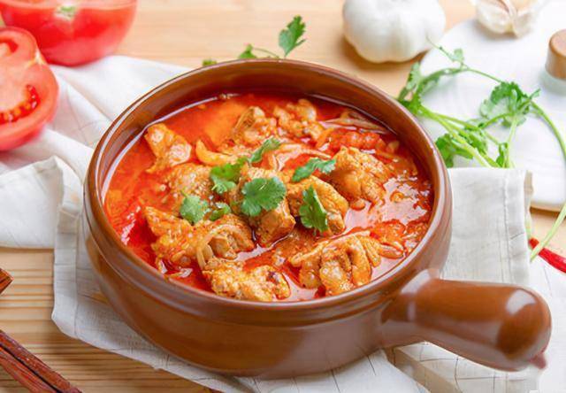 4、锅内放入色拉油,烧至五成热时,放入酸菜段和番茄丁,小火煸炒至番茄丁全部变为蓉泥,下入排骨和骨头汤,大火烧开,改小火煲40分钟,放入盐、鸡粉调味,撒入白胡椒粉离火。