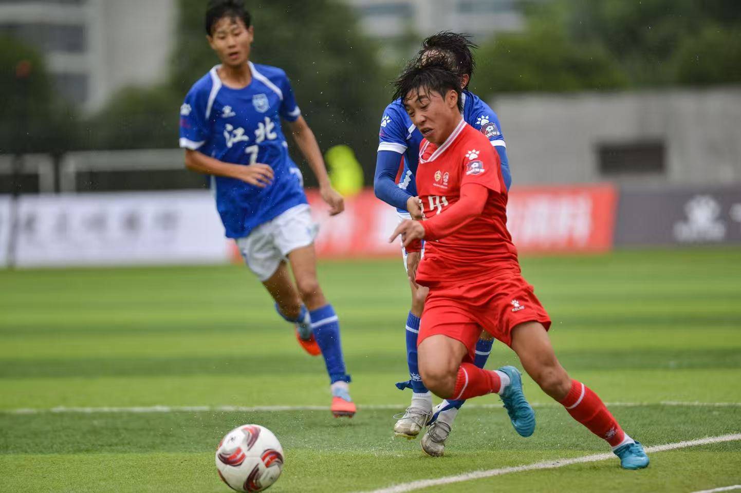 下午三时半,哨音划破湿重的空气,战役如期打响。甫一开场,江北信也队便借主场之势与天气之利,向渝中半岛队的腹地发起连绵冲击。他们的打法直接而高效,长传冲吊,利用湿滑的场地让皮球在草皮上不规则地加速窜动,意图十分明确。