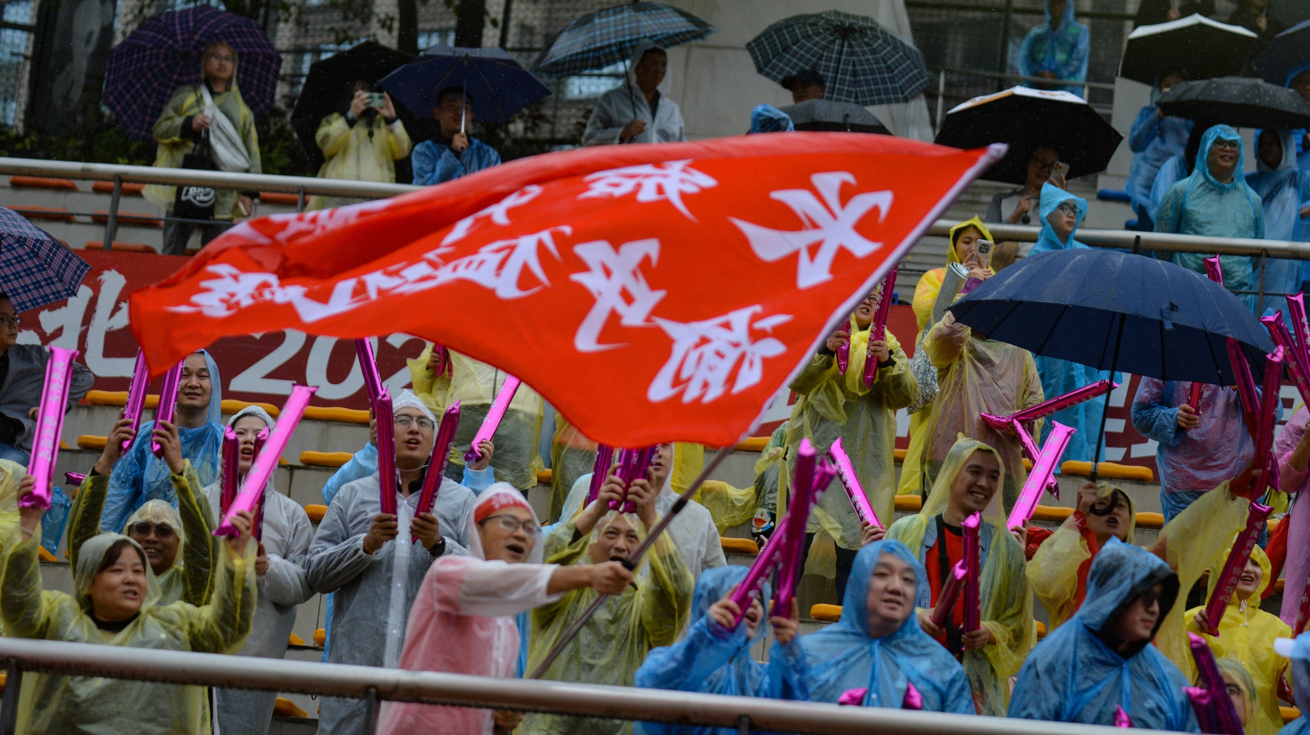 也正因为座位不多,渝中的球迷获得的席位当然更少,我没有仔细数过,但大致也就一百多人,挥舞着队旗,拿着充气棒,领喊的球迷还背着喇叭。本场比赛现场没有解说,也许有解说他们不太愿意说……这份刻意的“沉寂”,反倒让球迷最原始的呐喊、雨滴最直接的敲打,以及球场最真实的碰撞,交织成本场战役最纯粹,也最动人的背景音。