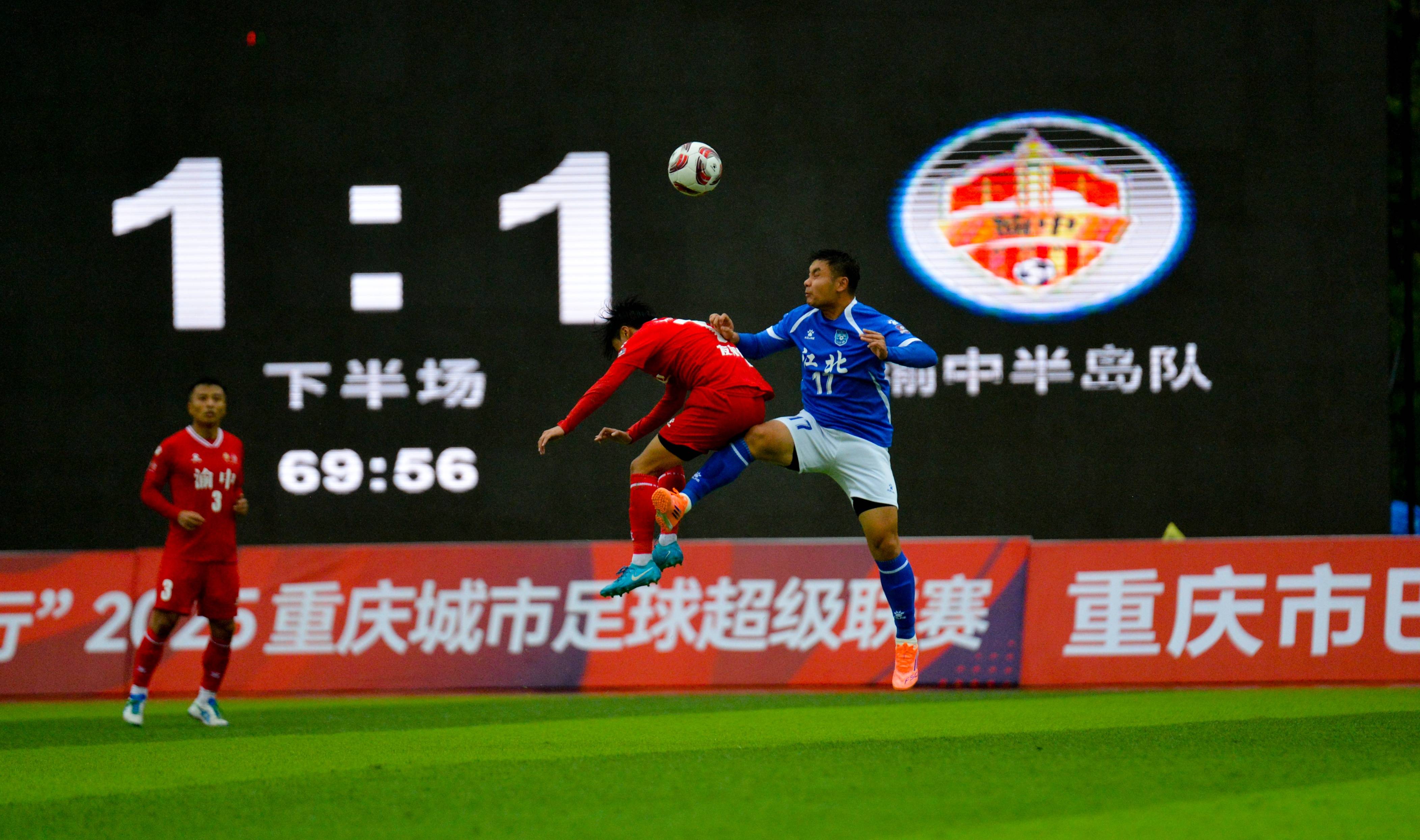 然而,领先后的时间流逝得格外缓慢。江北队倾巢而出,最后的伤停补时阶段,渝中半岛队的禁区风声鹤唳,承受着对手疯狂的轰炸。皮球如雨点般袭来,每一次攻门都牵动着所有人的心弦。