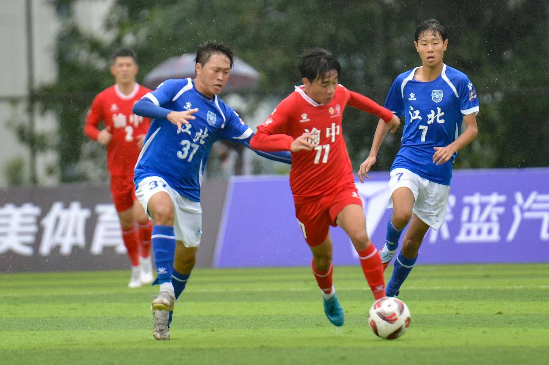 事实上,本场比赛对于渝中半岛队来说并不友好。与上次和两江深蓝汽车队的对战相似,又是打雨中足球,这对于实力占优的渝中来说,增加了变数,最重要的是,在雨中的比赛,草皮湿滑,很多技术动作都很容易变形,原本“技术流”很容易就变成“滑轨流”,更重要的是,江北石子山体育场的看台仅2000来个座位,渝中最引以为傲的球迷队伍,作为客队球迷只能有一百来个到达现场,为球队助威。